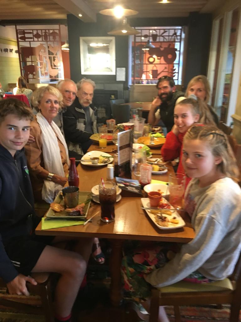 Debbie sharing a family lunchtime birthday meal in Weymouth. A photo featuring her 96 year old father Frank, daughter Emily, son in law, James plus grandchildren Jasmine, Alfie and Iris